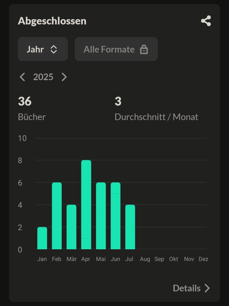 Das erste Halbjahr 2025 war außergewöhnlich lesereich für mich. Insgesamt 36 Bücher sind es geworden – das macht im Durchschnitt 5-6 Bücher pro Monat (Warum da 3 steht, weiß ich auch nicht).